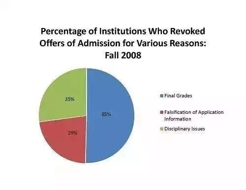 根据美国国家大学升学指导协会(NACAC)2009年的一项针对上一年大学招生录取的调查(见下图),约21%的大学有撤销录取的案例发生。最常见的原因根据调查(多选)显示有:高中最后一学年的成绩出现了问题(65%),然后是违纪情况(35%),再有就是申请资料的伪造(29%)。相对来说,公立大学(84%)比私立院校(49%)更容易出现撤销录取的情况;一些竞争更为激励的顶尖大学似乎更容易因为学生在高中最后一年的违规违纪而撤销录取。