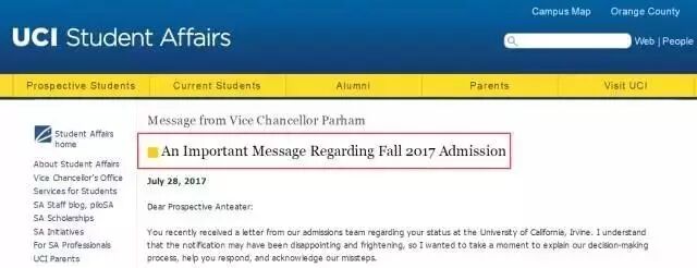 有时候学生被退学并非自身的原因,可能是高中学校未能寄送成绩单或老师提交了错误的成绩。如果是这样的情况,我们的网站上有上诉流程(http://www.admissions.uci.edu/apply/faq/appeals.php)。如果学生认为收到的通知有误,或学生有未能遵守规定的合理理由,都可以上诉。对于那些已经上诉的学生,我们在以最快的速度进行审理并且感谢你们在此期间的耐心等待。
