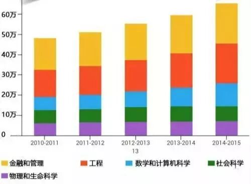 美国《门户开放报告》中有一项专门针对国际学生所学专业的统计。从2012—2013学年到2014—2015学年三年的数据来看,中国学生选择专业的倾向十分明确且稳定:最受欢迎的是商科,每年都有四分之一以上的人学习商科,在2014-2015学年,这部分学生的总人数超过8万。