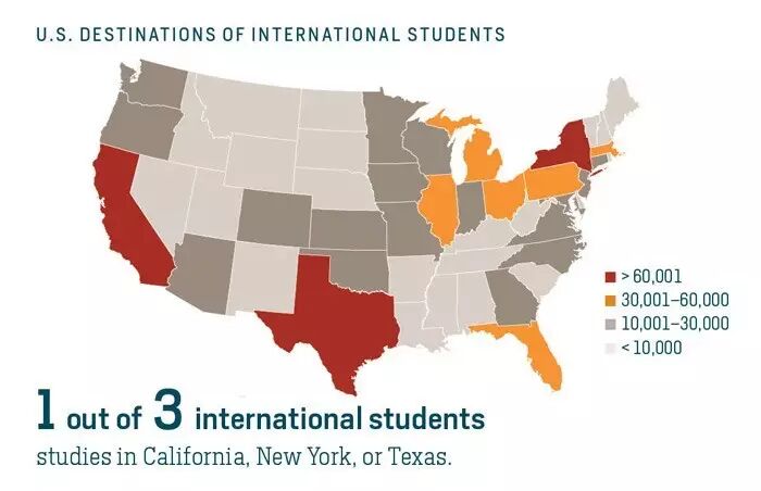 国际生大多集中在加州、纽约州和德克萨斯州。每三个留学生就有一个在以上这三个州区学习。2015/2016年,在加州留学的国际生人数超过14.9万,比上一学年增长10.5%。