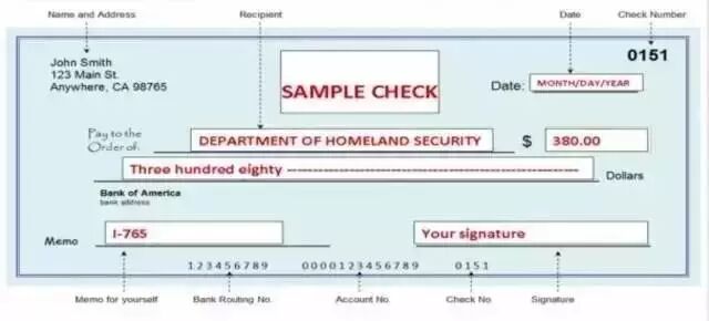 8.$ 410 支票(貌似今年又涨价了),不要夹带现金,Payable to the U.S. Department of Homeland Security (据说一定要是有自己名字的 personal check)。