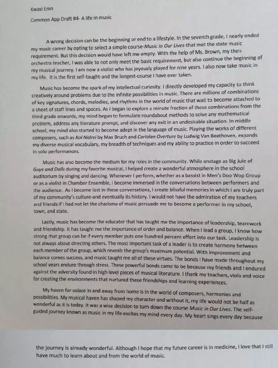 起手式是什么!!!为什么很多文章我们看了第一段就能断定是个高手,一定是他用生命在写第一段啊!!!第一段的究极奥义就是要抓住看官的眼球和引入主题。文章标题和第一段是Eassy最最重要的部分!!!这点是一定要牢记的。(以kwasi enin的Essay为例,他第一段写了自己“如果当时放弃了音乐,现在一定心灵空虚人生无趣啊什么的”之后立马一甩,扯到自己学了9年音乐。最大的点抖出来了,接下来不就是展开了么。)