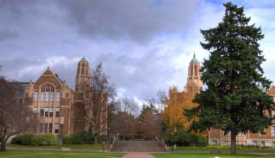 华盛顿大学坐落于华盛顿州西雅图市,700英亩大的校园位于美丽的华盛顿湖及联合湖边,有山有水,再加上校园内美丽的松树、樱花及古典雅致的建筑,华大的校园是全美公认很有诗意的。西雅图是美国西海岸北部最大的城市,是美国距远东最近的大型港口,著名的波音公司和微软公司皆位于西雅图市郊。这里是微软、波音、星巴克以及很多著名的摇滚乐队的诞生地。华大有3个校园,不过主校区仍位于西雅图市。