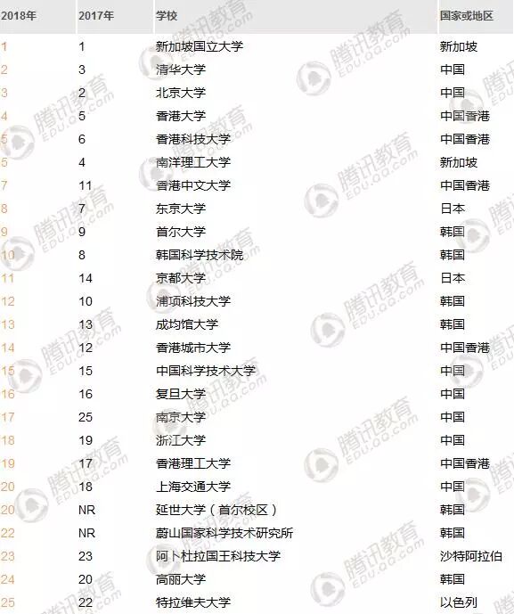 腾讯教育讯 2月7日,泰晤士高等教育(THE)发布了2018年亚洲大学排名。本次大学排名中,新加坡国立大学连续第三年居首,清华大学、北京大学分列二三位,这也是清华大学在THE亚洲大学排名中首次超越北京大学,成为排名第一的中国高校。