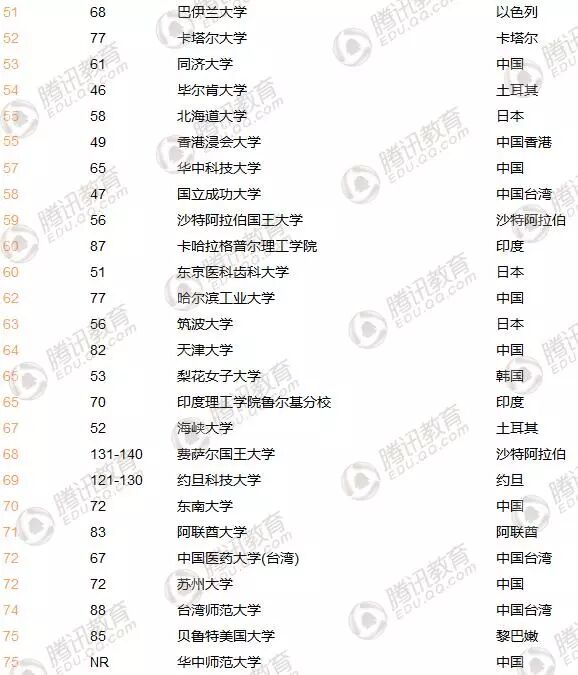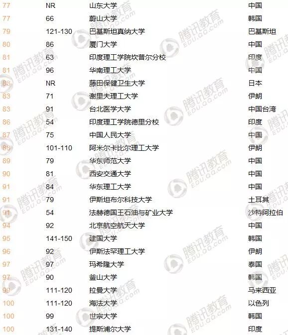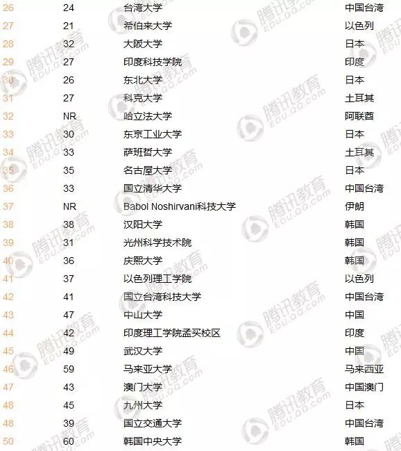 本次大学排名前十中,中国高校占据五席,除了清华、北大之外,香港大学位列第四,香港科技大学和南洋理工大学并列第五,香港中文大学则排在第七位。第八至第十位的高校分别是东京大学、首尔大学和韩国科学技术院。