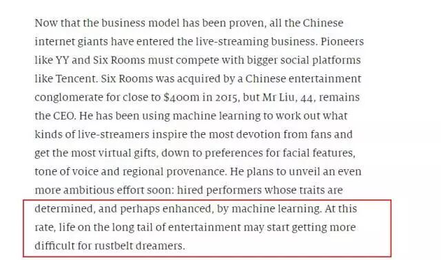 这篇文章主要讲中国直播行业的发展,其中提到了娱乐行业的“长尾效应”(“长尾理论”最初由《连线》的总编辑克里斯·安德森提出,用于描述那些原来不受到重视的销量小但种类多的产品或服务由于总量巨大,累积起来的总收益超过主流产品的现象)。文章最后一句话 life on the long tail of entertainment 是指“位于娱乐业长尾效应后端的那一部分人的生活”。
