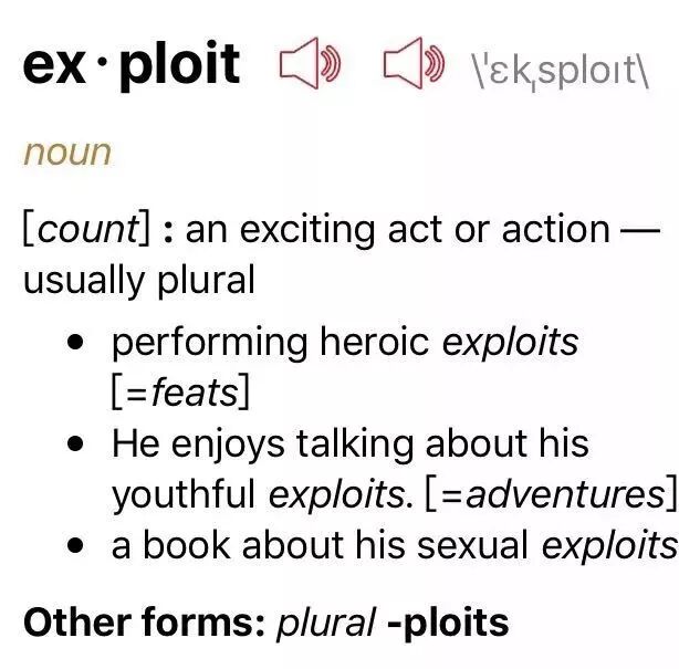 比如上面那个"She was telling me about her exploits while travelling around Africa.",如果把"exploits"理解为“剥削”的话感觉会非常奇怪:她去非洲旅游和剥削有什么关系? 这时候你应该去翻一翻英英词典: