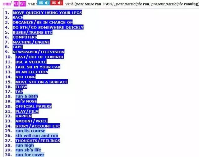 一词多义在英语中是非常常见的一个现象,越是简单的单词越容易出现多义的情况,比如对于我们熟悉的单词"run",在朗文词典中就有超过60个释义项: