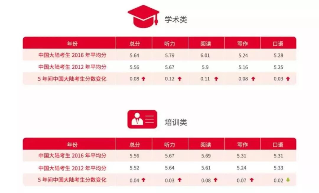 2016年大陆地区雅思成绩主要集中在5.5和6分的梯队,5.5分占24.9%、6.0分占22.5%。托福考生的平均成绩是79分。在2012年到2016年的5年里,大陆学生的雅思、托福成绩略有提升,其中听力和阅读成绩提升明显,口语单项成绩提升最不明显。