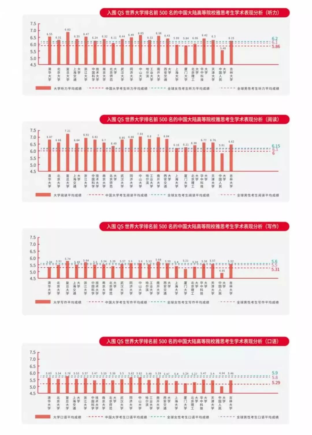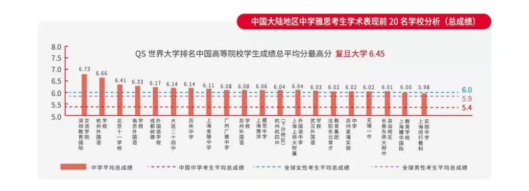 从院校排名来说,上海等院校考生听说读写能力居全国之首,复旦大学雅思考生听说读写能力均入围QS世界大学排名前500的中国高等院校之首。高中以学校为单位的考生中国际学校的考生表现最为突出。