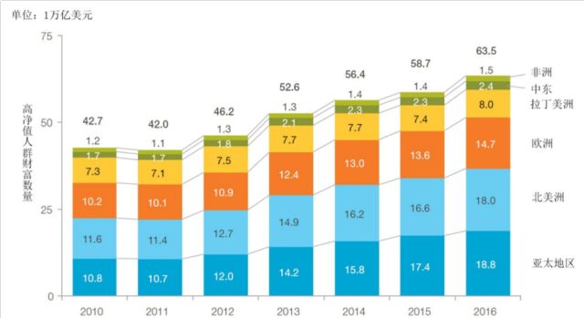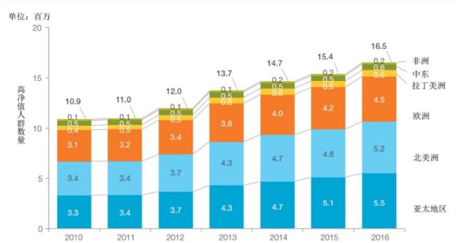 相对应的,是高净值人群财富拥有数量快速增加:亚太地区的高净值人群财富增长从2010年的10.8万亿美元增至2016年的18.8万亿美元,增幅达到74%。高净值人群数量也在大幅增加,从2010年的330万增加到2016年的550万,增幅达到67%。