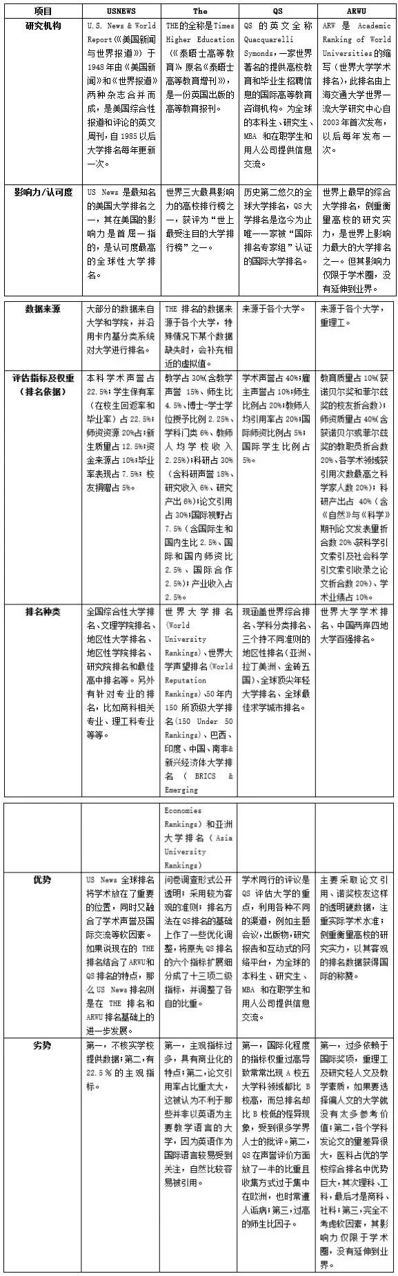 同样,排名也分为USNEWS、ARWU、THE、QS排名,在择校和这些大学排名之间,我们究竟应该相信哪个?下面简单介绍4种大学排名以及它们的侧重点,供大家在选校时参考。