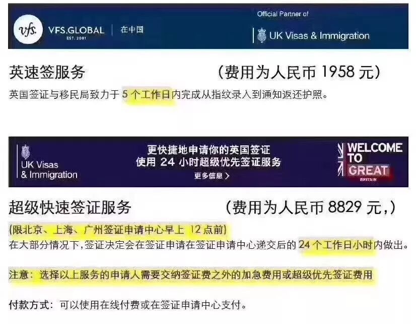 China:普通:(15工作日出结果)335 磅涨为 348镑快签费: (3-5工作日出结果), 184磅涨为 212镑 (额外付)面签费: (24工作小时作日出结果),919 磅涨为 956镑 (额外付)