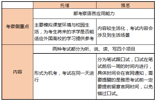 从内容上来说,雅思主要是交谈以及描述一样东西,2分钟的描述时间要求对某些考生来说是比较痛苦的,而托福则是发表观点和复述听力内容。托福在形式上比较多变,先是发表观点,后是先听听力再讲。所以在托福口语中听力也是至关重要的,如果啥都没听见那就啥都没得讲。