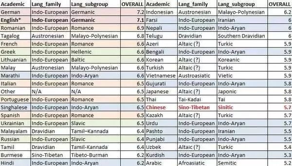 母语结构对英语考试水准的影响到底有多大呢?印欧语系内部语言到底有没有先天优势?我们不妨再来依靠雅思的数据来统计一下。