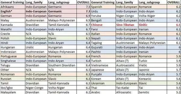 当然,日耳曼族语言有着绝对的碾压级优势,这是不用说的了。罗曼族及其他印欧语系的语言相比之下,优势并没有那么明显,甚至亚洲区诸语言和汉语本身的情况不相上下。