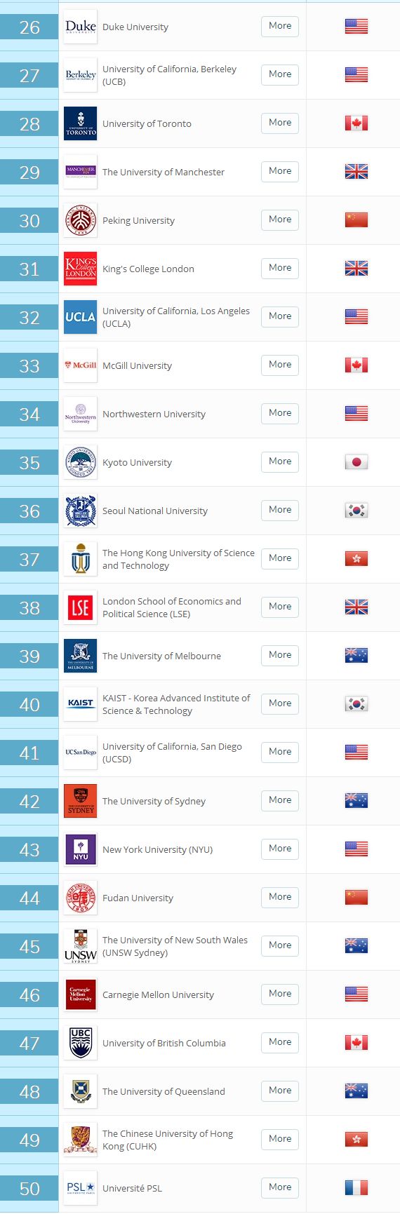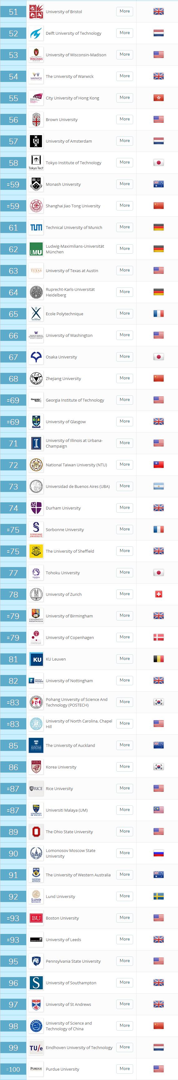 今年依然有六所中国大陆的大学进入QS榜单的TOP100名,值得注意的是,今年清华大学首次冲进前20名,位列17名。把一众欧美名校甩在了身后。北京大学则挺进了TOP30。总体来看,多数中国大学的排名都在上升。
