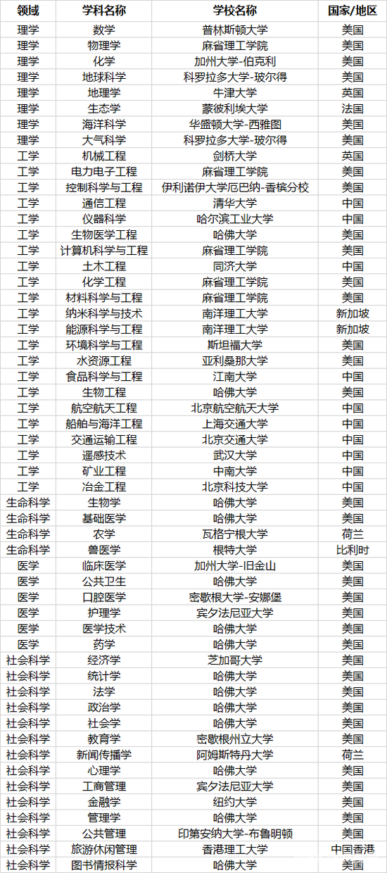 美国大学在各学科排名上仍然占据绝对优势,在35个学科中夺冠,上榜总次数达到4808次,其中哈佛大学占据14个学科榜首。中国内地高校也表现强劲,在10个学科位列世界第一,分别是清华大学(分数线,专业设置)(通信工程)、哈尔滨工业大学(仪器科学)、同济大学(土木工程)、上海交通大学(船舶与海洋工程)、武汉大学(遥感技术)、北京科技大学(分数线,专业设置)(冶金工程)、北京航空航天大学(分数线,专业设置)(航空航天工程)、北京交通大学(分数线,专业设置)(交通运输工程)、江南大学(食品科学与工程)和中南大学(矿业工程)。其中江南大学的食品科学与工程和中南大学的矿业工程是首次占据世界第一。